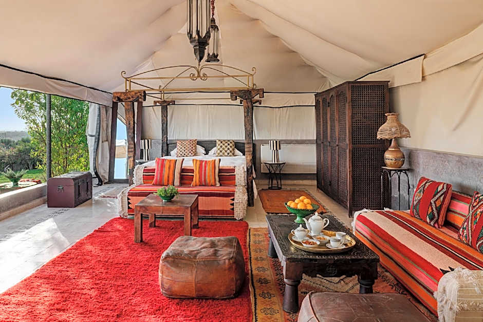 Large tented suites located in the garden, each with four-poster beds and large ornate private bathrooms with sculptured oversize mosaic baths. Private terraces and large seating area, to view the magnificent sunset views over the olive groves. Perfect if you want to experience the true desert experience. Breakfast, fruit and complimentary water is included.