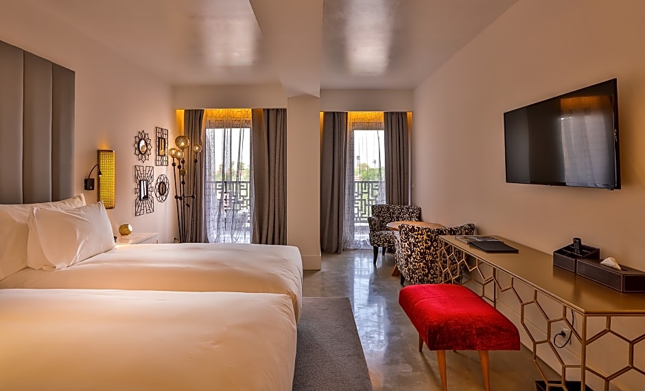 The room was huge with a massive bed which was extremely comfortable. The 2 pools were stunning - downstairs was better for quiet chill time, and the upstairs rooftop pool was drinks and music vibes. The brekkie was delicious. The surrounding area itself is really nice, walkable to lots of bars and restaurants and we felt very safe. It’s only about 10 mins taxi to the medina where you find the souk etc. For us it was perfect to stay in an area like this rather than the medina as we wanted a large pool and air conditioning as we went in June when the temperatures reached mid 40s. The staff were really helpful in arranging tours and taxis.