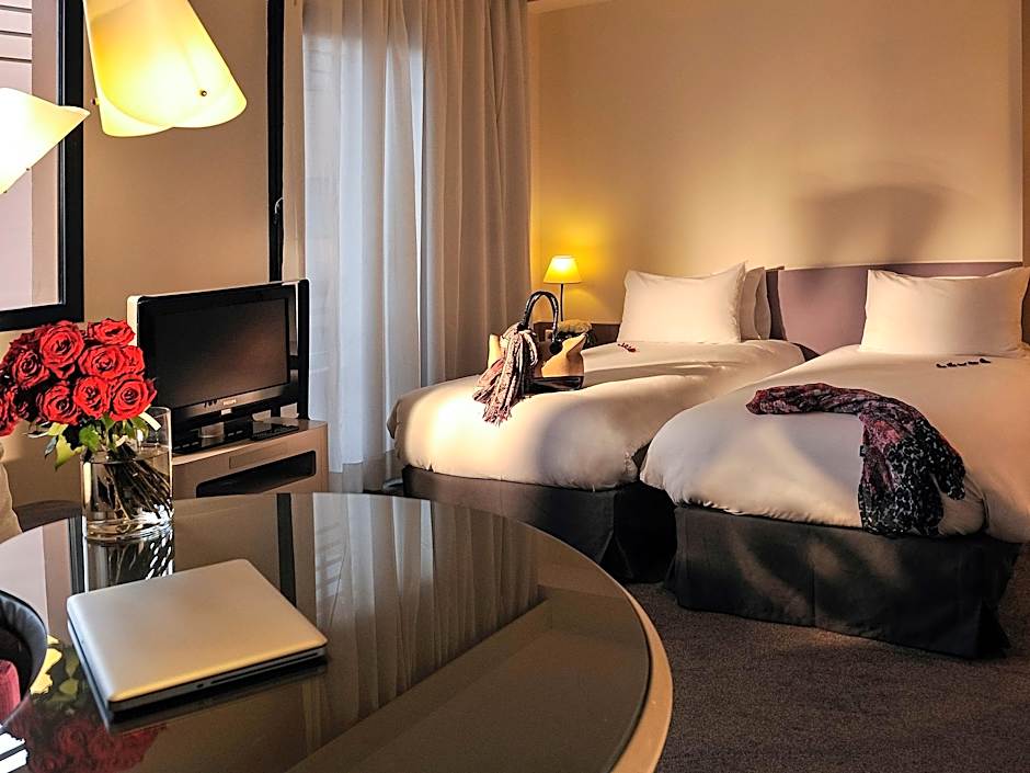 Novotel Marrakech Hivernage offers a variety of room options including Double, Twin, and Superior rooms with different bed configurations such as Double beds, Twin beds, Queen beds, and Sofa beds. The rooms can accommodate 2 adults and 1 child with some rooms providing city views or pool views. Smoking is not allowed in any of the rooms.