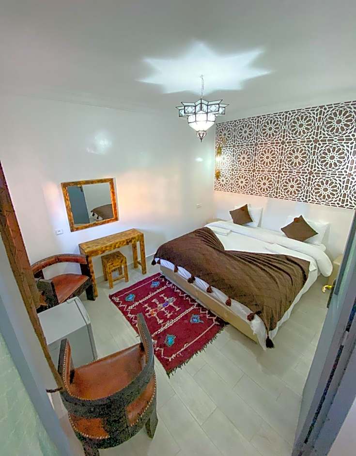 Lovely little hotel in a great spot off the main road through Ouarzazate. Parking feels safe out the front and the staff are so friendly and welcoming. Greeted with a cup of Moroccan tea and a slice of cake. We stayed twice in this hotel, on the way from Marrakech to the Sahara and then on the way back again. Both times, we received the same excellent service and a different room each time. Both rooms were comfortable with heating and a hot shower. Breakfast was ample with bread, yogurt, juice and tea or coffee. We also ate dinner here on both occasions and the food was really great and a good price @ 9 euros per head for a 3 course meal. Highly recommend and would definitely stay again