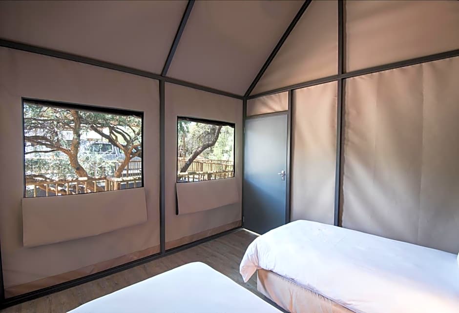 This air-conditioned meru-style tent has an private bathroom and a furnished private patio offering views of the gardens. The tent is equipped with a bedside table and lamp, an electrical socket and shelving. The tent is also fitted with a fridge, kettle, BBQ facilities and a sink area located outside the unit. The bathroom is fitted with a shower and towels and linen are provided. A daily cleaning service is offered.