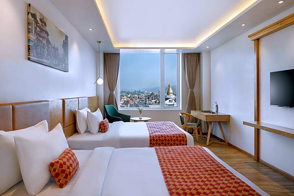 Views vary among garden, landmark, and mountain, with garden spaces and on-site parking available, and close proximity to Boudhanath adding Kathmandu flavor to every stay.