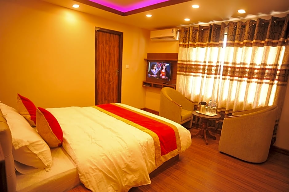 Practical comforts include an on-site restaurant, free private parking, and complimentary Wifi, along with room service. Shuttle services and airport transfers are available for an extra charge, while air conditioning and soundproof rooms help ensure a peaceful stay. Additional amenities include a terrace with views, balcony, 24-hour front desk, non-smoking rooms, wheelchair accessibility, an elevator, and free toiletries with a bidet; a kid-friendly buffet and kids' meals are available for an extra charge. A bar and tour desk add convenient touches for exploring Kathmandu.