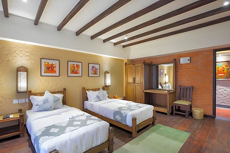 The Hotel Thamel House offers three types of rooms. The Superior Double or Twin Room has a size of 301 sqft, features two twin beds and one queen-size bed, and can accommodate two adults. Smoking is not allowed. The Deluxe Queen Suite has a size of 398 sqft and accommodates two adults in a queen-size bed. Smoking is not allowed. The Deluxe Double or Twin Room has a size of 205 sqft, features two twin beds and one queen-size bed, and can accommodate two adults. Smoking is not allowed.