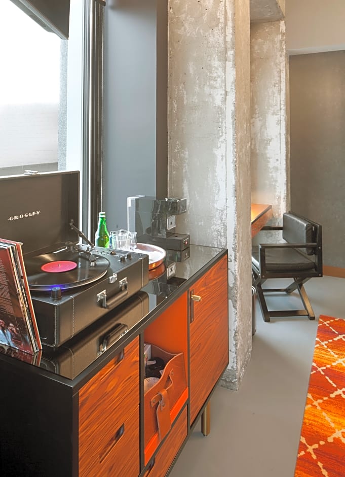 The Superior King Corner Rooms come with floor-to-ceiling windows. The showers are positioned against the glass wall. The rooms come with king size bedding and floating window benches. This Double Corner Room features a Crosley record player.