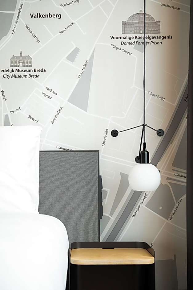 I was surprised by the location being so close to the main train station (Breda Centraal), but it is a very clean area and the hotel is spotless and up to date with has VERY quiet rooms - was never disturbed by a train noise even though we could see them pass below us....pretty amazing sound proof windows. Friendly accomodating staff. Bike rental was easy and getting around Breda was too. If you experience good weather, be sure to just sit and chill with some beverages and munchies in Valkenburg Park - great scene. Trattoria Perron in front of train station on Stationsplein was a delight!