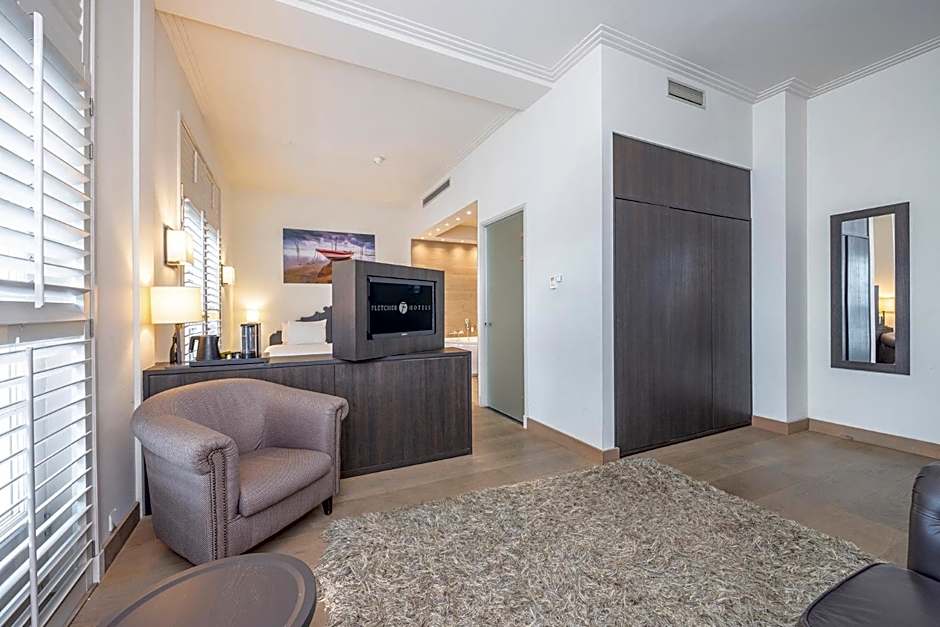 A spacious suite featuring a comfortable seating corner with flat-screen TV and spa bath in the bathroom. It features wide views of the Gooimeer lake.