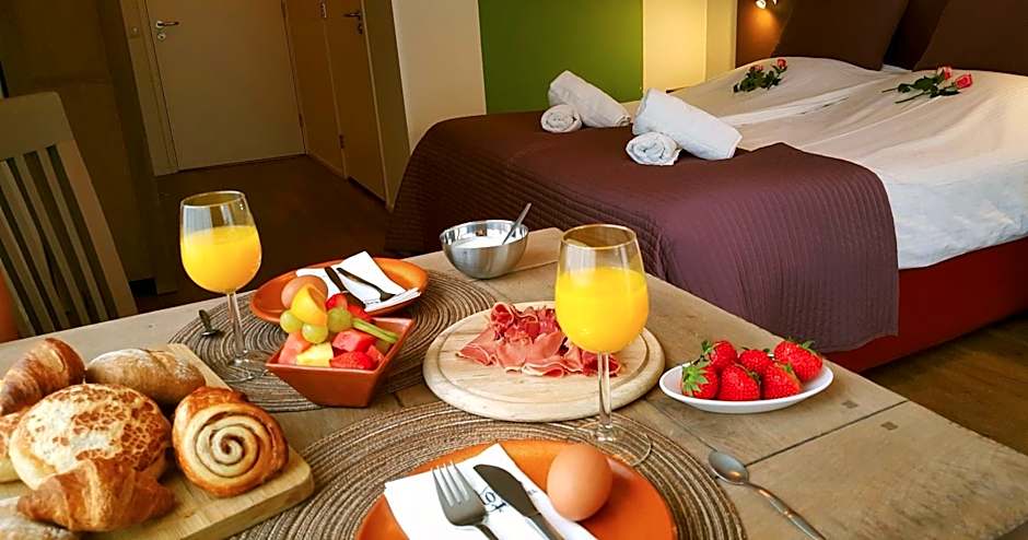 This spacious hotel room is located on the first floor and features a balcony. The studio has a comfortable seating area and a sleeping mezzanine. The studio features 1 double bed and 2 single beds. On request it is possible to place 2 extra beds in the room. The bathroom features a sunshower (solarium under the shower) and a rain shower.