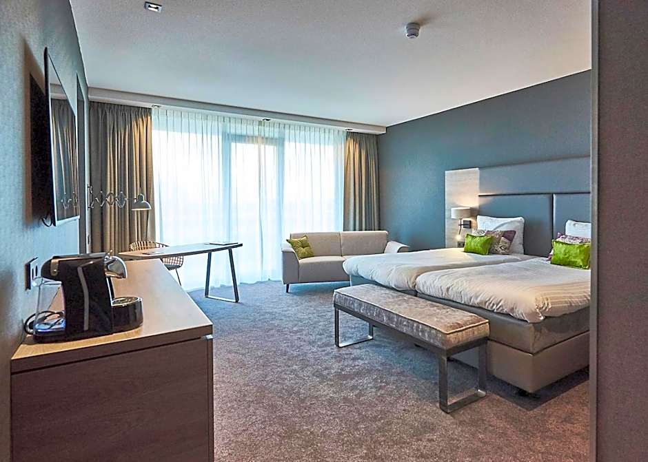 The Van der Valk Hotel Leeuwarden offers a variety of room types including Suites, Twin rooms, Double rooms, and Family rooms. Smoking is not allowed in any of the rooms. The rooms have different occupancy capacities, ranging from 2 adults in the Superior Double Room to 6 adults in the Deluxe Family Room. The bed sizes vary as well, with options such as King size, Queen size, and Twin beds available.