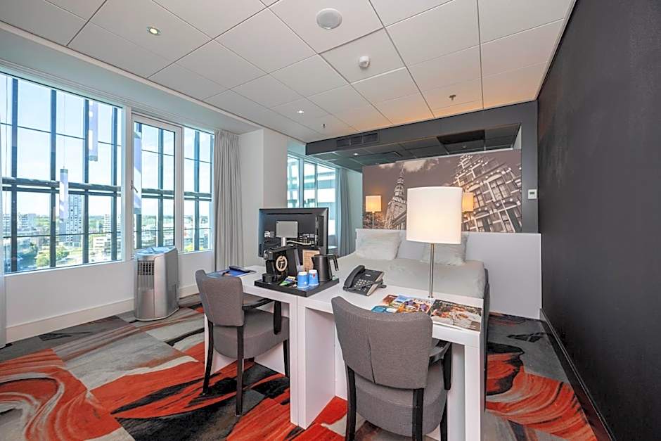 Great location next to the train station. Walk out the back (farthest away from Albert Heijn To Go), turn left and go into the nearest large building, into lobby and take elevator to 12th floor for check in. Check in is 3 pm or later, early check-in may be possible for a 25 Euro charge. We stored our luggage instead and came back after 3. We had a view of train station and lines with only little sound. We had a Suite (1 bedroom with door), 2 Tvs, 4 English TV channels. Also, fridge, coffee maker, kettle shower (rainshower type). The room had effective dark, blackout curtains. Soft big bed, but not too soft with thick quilt/blanket which was very warm. Good hotel with great location (near train, buses, 2 supermarkets across from train station, and historic downtown area) and friendly helpful staff and would stay again if in area.