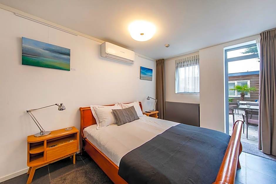 This superior double room is located next to the (shared) kitchen and has his own entrance to the terrace/garden, equipped with a king-sized bed with luxurious bed linen, closet, TV, Air conditioning, an open private bathroom, the toilet has a sliding door.