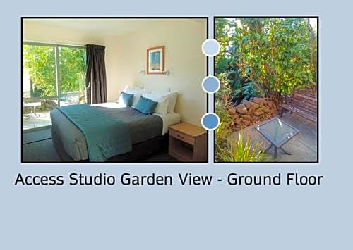 A diverse range of accommodations is available, including Studio variants, Queen rooms, King rooms, and Apartments, with several options offering balconies. River view and garden view scenes unfold from patios and balconies, adding a scenic backdrop to the stay. Kitchenware and garden space are common features in many units, providing practical charm for longer getaways.
