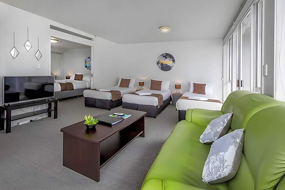 This open-plan, one-bedroom suite features a spacious living area decorated with modern furniture. The suite also offers a bathroom with separate shower, basin and toilet. Fully equipped kitchens with oven, and dining tables and chairs, make dining easy with full tea and coffee making facilities, fridge and freezer, microwave and stove top elements. All cooking utensils and cutlery are supplied. Also included are laundry facilities, including a washing machine and dryer. The Suite features a Queen bed in a separate bedroom with 3 single beds in the lounge area.