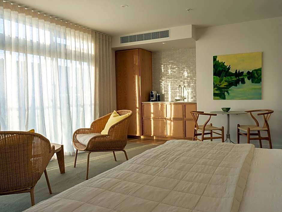 This contemporary suite has a designer kitchen. There is a luxurious Sealy super king size bed. 50-inch LED Smart TV and complimentary WiFi. A large work desk with built-in power points and multiple power adapter sockets are available. An iPod docking station/Bluetooth Audio System, energy saving LED lights, black-out, full length textured curtains, a sensor, lit-up bedroom and bathroom are included. The spacious, designer, private bathroom has a high-pressured, walk-in, luxury shower and double basins. There are luxury bathrobes and toiletries, complimentary slippers, and a security safe. The spacious designer kitchen has a dish drawer, microwave, refrigerator and a Nespresso coffee machine.