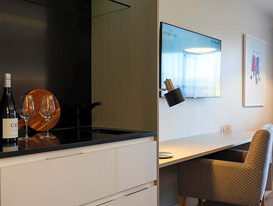 This contemporary one bedroom suite has a separate lounge area from the bedroom and features a designer kitchenette. There is a luxurious Sealy super King size bed, a queen sofa bed, 2 50-inch LED Smart TVs and complimentary WiFi. A large work desk with built-in power points and multiple power adapter sockets are available. An iPod docking station/Bluetooth Audio System, energy saving LED lights, a sensor, lit-up bedroom and bathroom are included. The spacious, designer, private bathroom has a high-pressured, walk-in, luxury shower and double basins. There are luxury bathrobes and toiletries, complimentary slippers, and a security safe. The spacious designer kitchen has a dish drawer, microwave, refrigerator and a Nespresso coffee machine.