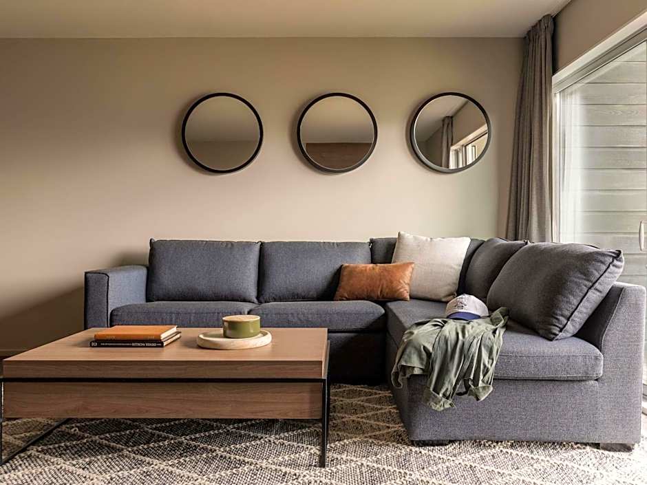 This resort-style, 2-bedroom suite is spread over 2 levels. It features a spacious lounge with a gas fireplace as well as a full kitchen, dining area, air-conditioning, complimentary tea/coffee making facilities and a refrigerator. There is an LCD TV with satellite channels as well as a DVD player, telephone, desk, coffee table, arm chairs an alarm clock radio and 2 separate bedrooms, each with a king-sized bed. There is 1 separate bathroom with a shower, bath, heated towel rail, hairdryer and ironing facilities. The outdoor deck overlookerling alpine views.