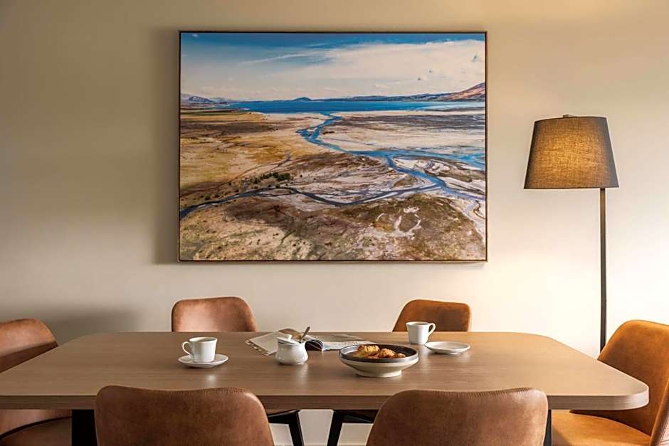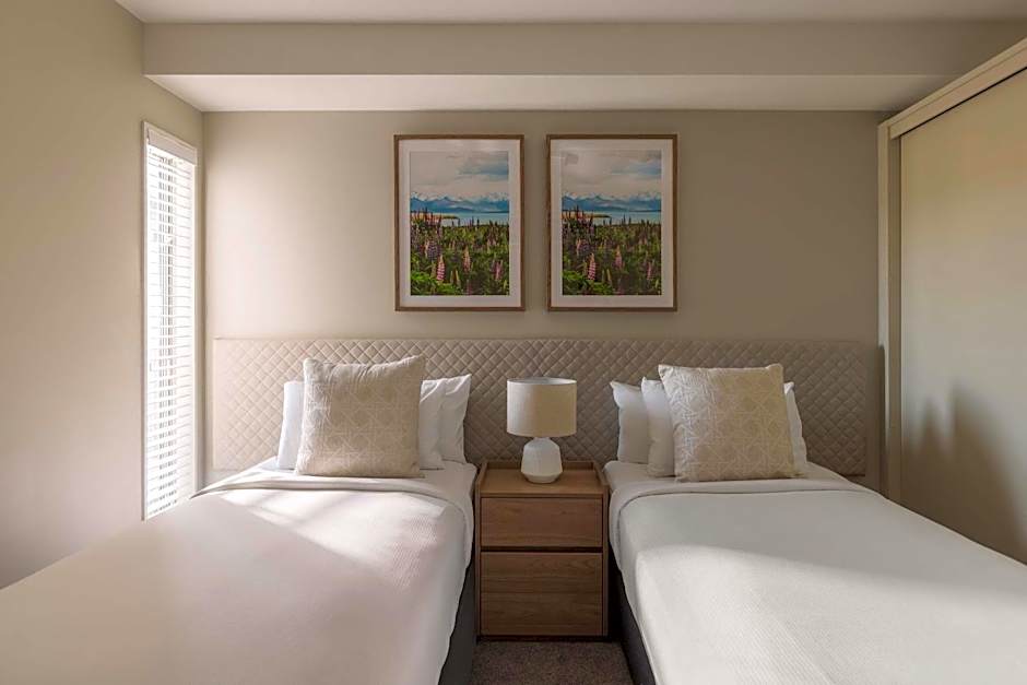 This resort-style, 2-bedroom suite is spread over 2 levels. It features a spacious lounge with a gas fireplace as well as a full kitchen, dining area, air-conditioning, complimentary tea/coffee making facilities and a refrigerator. There is an LCD TV with satellite channels as well as a DVD player, telephone, desk, coffee table, arm chairs an alarm clock radio and 2 separate bedrooms, each with a king-sized bed. There is 1 separate bathroom with a shower, bath, heated towel rail, hairdryer and ironing facilities. The outdoor deck overlooks the stunning Lake Tekapo. If you require a change of bedding configuration after arrival a fee of $30 will apply.