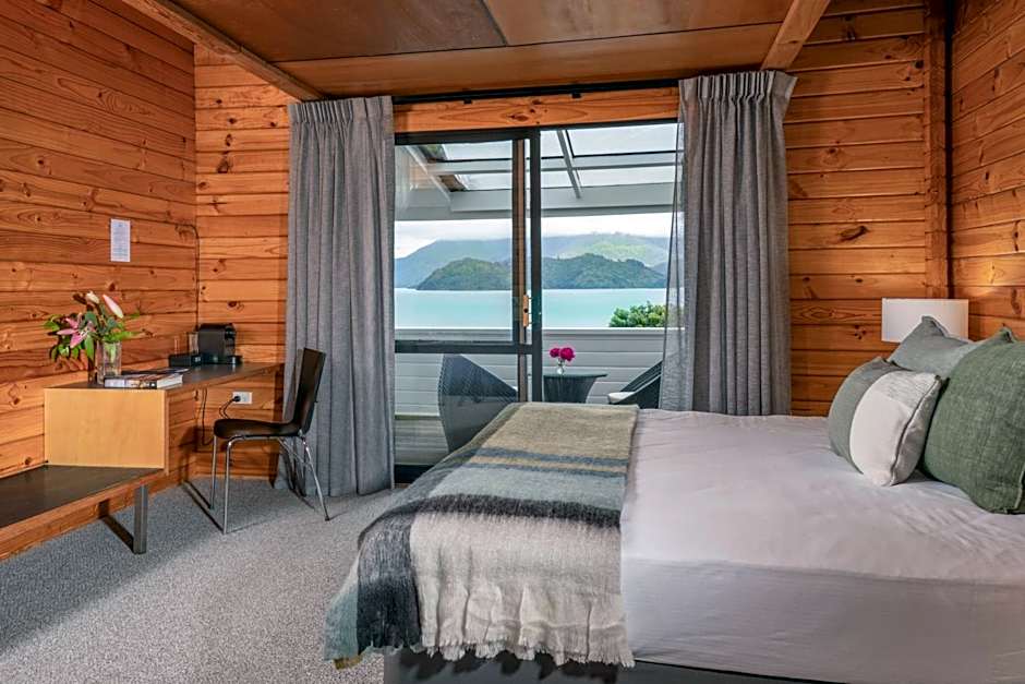 These Korimako rooms are perfect for small families to stay together and enjoy the views across the center of the hotel down to Portage Bay. Featuring a sunroom rather than a deck. These rooms are sun and light filled and sleep up to 4 people with a super king bed and two singles or can be configured into four singles. These rooms can be booked as interconnecting rooms to hold larger groups up to 8 people (two rooms).