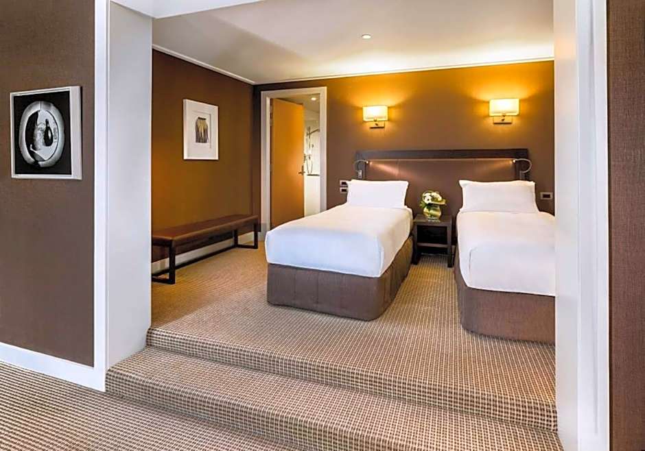 Twin Hilton Deluxe Lakeview is 474 square feet and includes 2 single beds 80-130 width plus balcony, extra beds on demand, satellite tv , hairdryer, tea and coffee making facilities , and safe.
