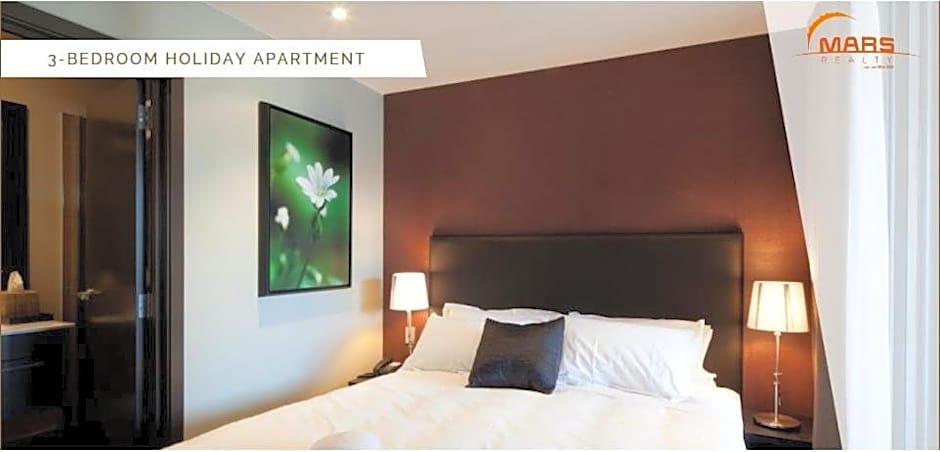 A wide range of apartment configurations awaits, from 2-bedroom up to 6-bedroom layouts, plus a Penthouse Apartment for something extra special. Some units sleep up to 12 adults (the Six-Bedroom Apartment), while others accommodate 10 adults and 6 children. Bed arrangements vary, including setups such as 2 x Twin beds and 1 x King size bed in certain 2-bedroom layouts, and 2 x King size beds in other suites.