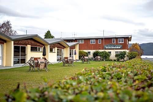 The Alpine View Motel offers a variety of room types including Studio - Disability Access, One-Bedroom Apartment, Large Family Apartment, and Lake View Upstairs Studio. None of the rooms allow smoking and they range in size from 355 sqft to 431 sqft. Occupancy varies with some rooms accommodating up to 5 adults and 4 children, while others accommodate 2 adults with no children. Bed sizes include King, Twin, and Queen.