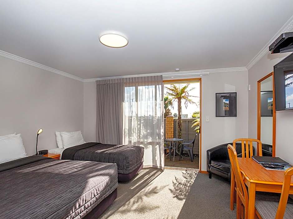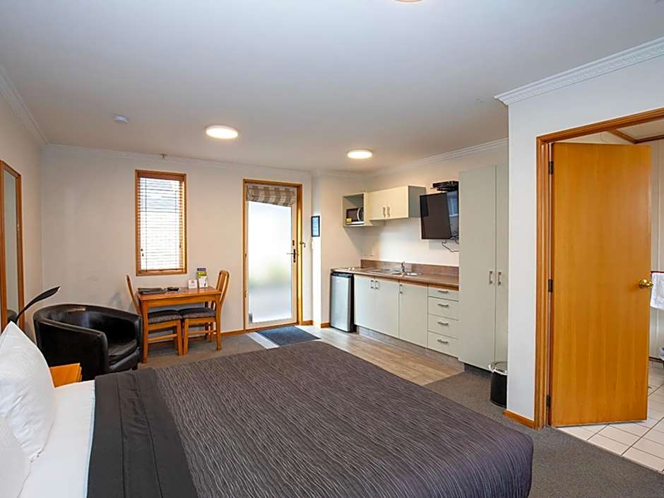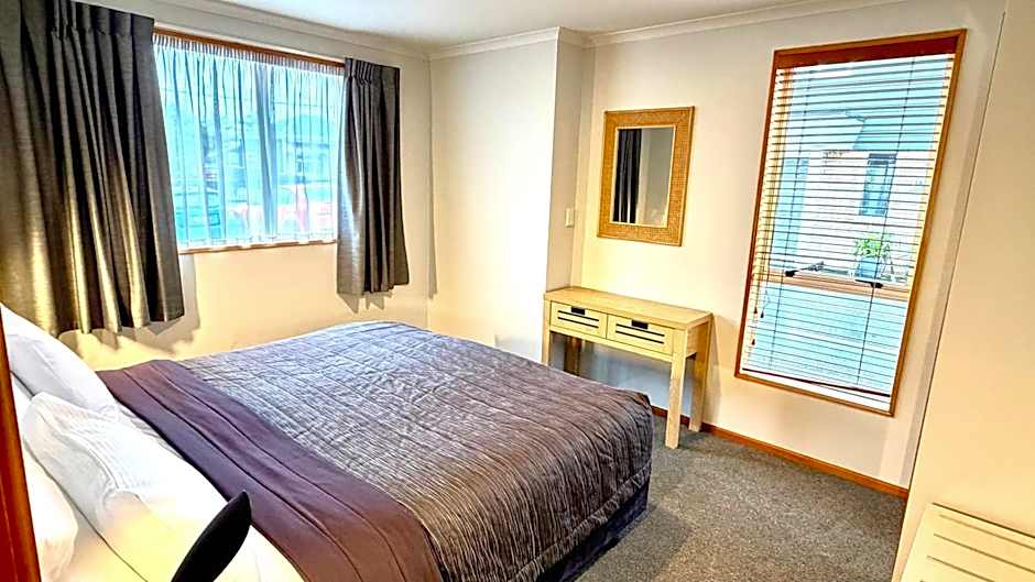 One queen bed and one single bed. Cooking facilities include microwave, electric frypan, ceramic cooktop with two hotplates and tea/coffee making facilities. Great selection of teas and coffees including Tuatara plunger coffee. Units are either on the ground floor with a sliding door to a private courtyard or upstairs with a sliding door to a balcony with outdoor seating (preference if stated will be accommodated if possible).