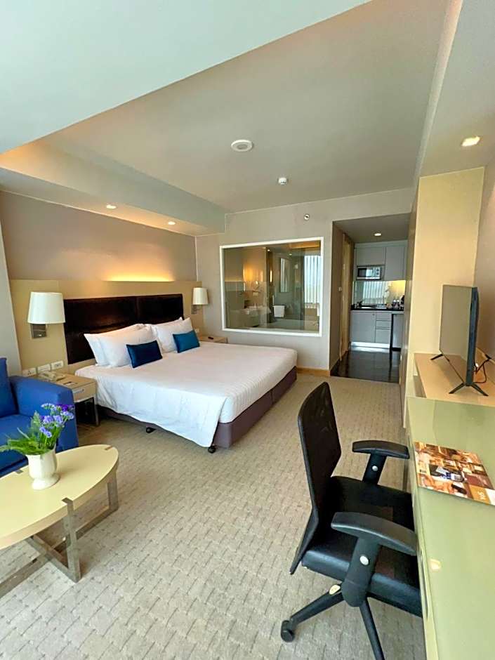 Ontspan in uw ruime, geluiddichte kamer met uitzicht op het meer, of stap naar buiten op uw privébalkon om van de levendige sfeer van de stad te genieten. Fijnproevers waarderen het restaurant en de bar ter plaatse, perfect om te ontspannen na een dag het verkennen van de bezienswaardigheden van Bangkok. Voor uw gemak biedt het hotel gratis privéparkeergelegenheid, een luchthavenshuttle en roomservice, allemaal bedoeld om uw verblijf soepel te laten verlopen. Bovendien zijn huisdieren welkom tegen bijkomende toeslagen, waardoor deze plek echt gastvrij is voor iedere reiziger.
