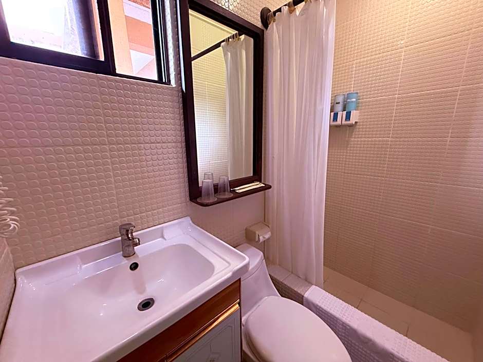 This room includes a refrigerator and a flat-screen TV with cable channels. The bathroom provides free toiletries.