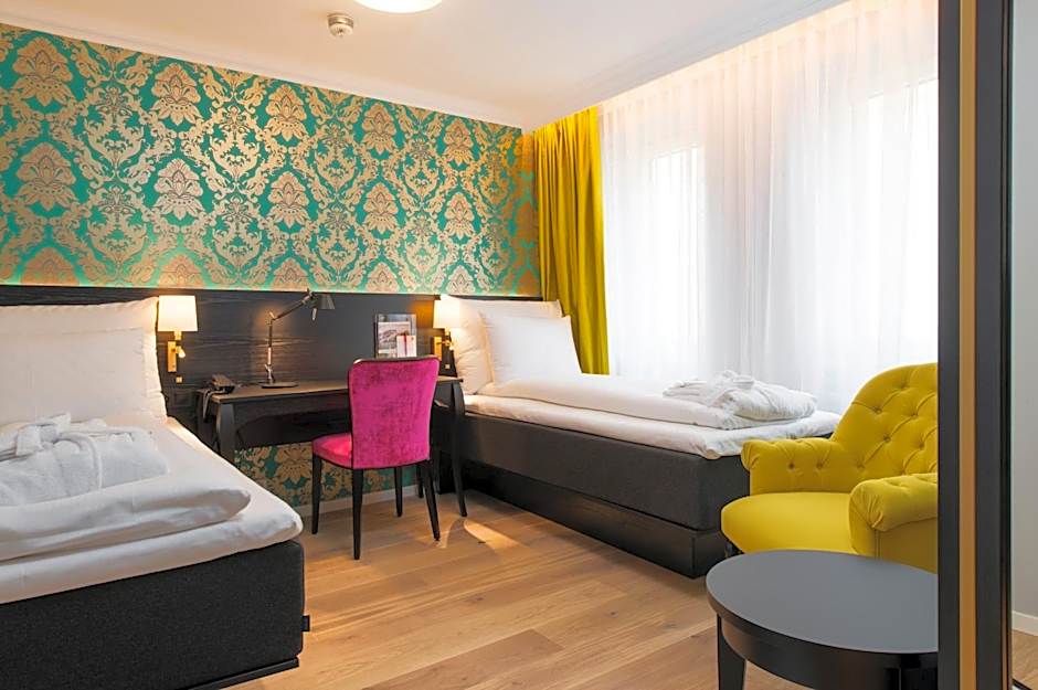 The Thon Hotel Rosenkrantz Bergen offers a variety of room types including standard twin rooms with two twin beds, small double rooms with a double bed recommended for single occupancy, business double rooms with a double bed, standard single rooms with a twin bed for single occupancy, superior double rooms with a double bed, and standard double rooms with a double bed. All rooms are non-smoking and have different sizes ranging from 86 sqft to 161 sqft. Occupancy varies from 1 to 4 adults depending on the room type.
