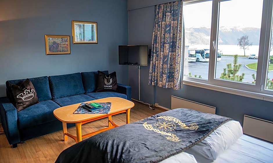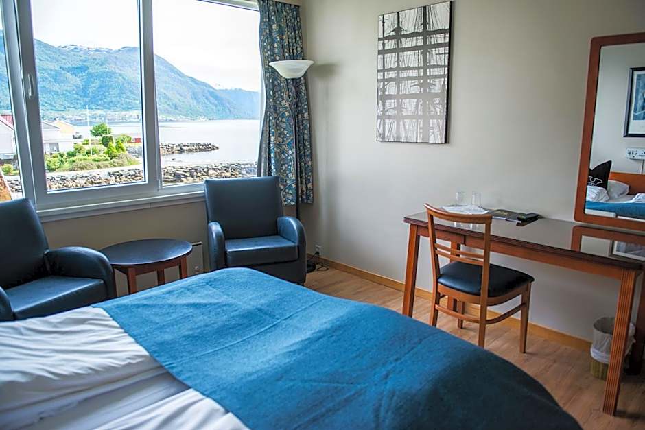 Strandavegen 1 locates the hotel near the fjord, offering easy access to the private beach area and scenic balcony views. Family-friendly features include kids' meals and a garden-friendly outdoor space, making it a lively base for exploring Leikanger.