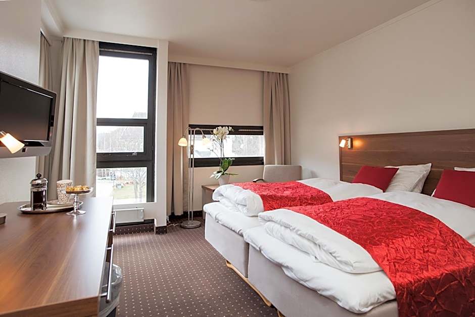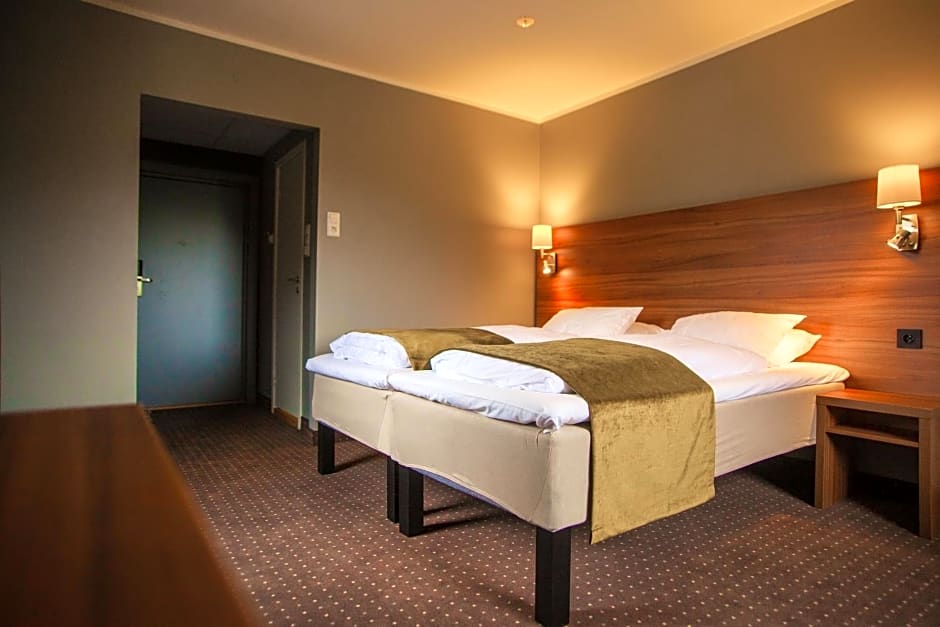This hotel was a pleasant surprise on arrival, with a much better overall standard and attractiveness than I had expected, following a mediocre review by Lonely Planet. The public areas are well designed and the bedroom was very spacious. We booked a double and a twin and received a Business Double which was large and well equipped including sofa area, large TV,fridge , coffee machine and desk. Breakfast was the best buffet choice we have experienced in Norway so far. The location may not be the most attractive, but it is just off the main road network and a handy stop over. We ate at a local restaurant Pillarguri Kafe, which was excellent.