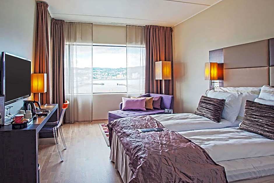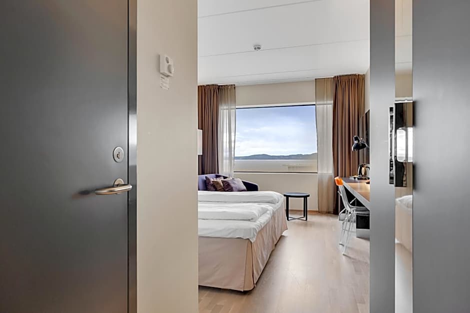 Modern room with a flat-screen TV, mini-bar and electric kettle. It features views over Trondheim or the fjord.
