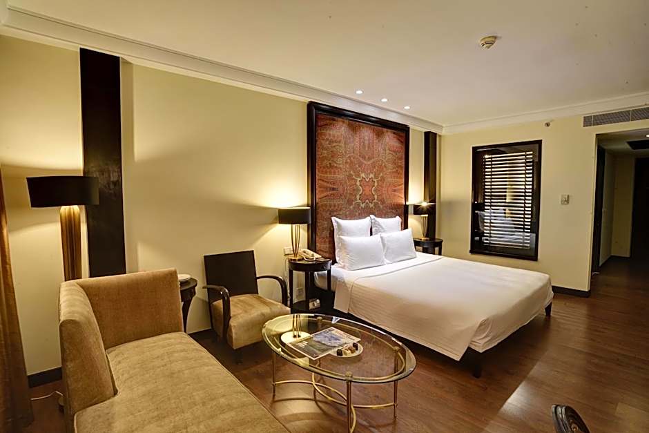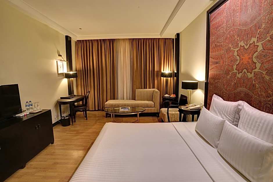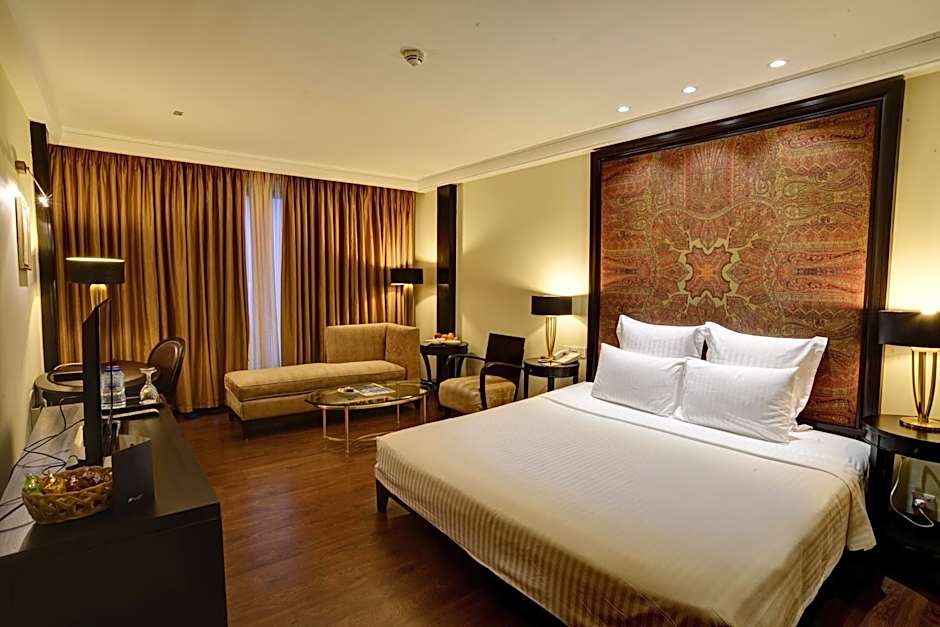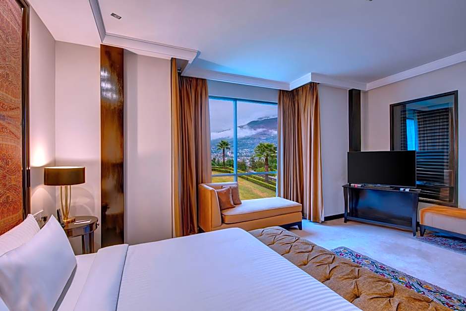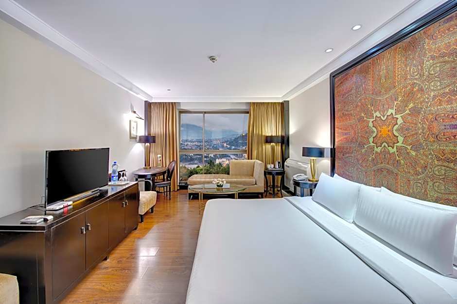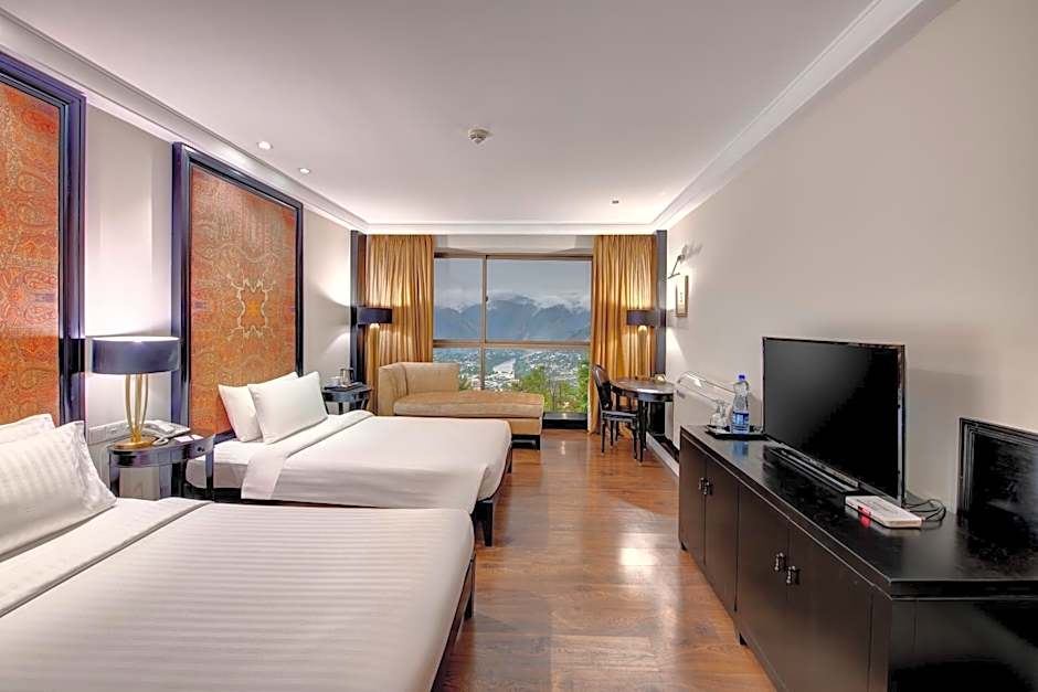 Spacious room offers a flat-screen TV, sofa seating area and private balcony that overlooks the Kashmir Mountains.
