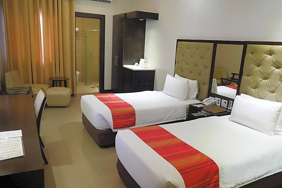 Castle Peak Hotel offers two types of rooms: Grand Superior Double or Twin Room and Deluxe Double or Twin Room. Both room types have a room size of around 250 square feet and can accommodate 2 adults and 1 child. Smoking is not allowed in both room types. The Grand Superior room has 1 double bed and 2 twin beds, while the Deluxe room has 1 queen-size bed and 2 twin beds.