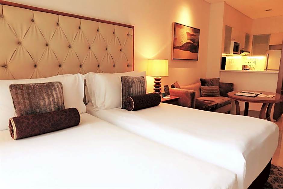 The hotel offers two types of rooms: suites and studios. Suites include the Two-Bedroom Executive Suite, One-Bedroom Executive King Suite, and One-Bedroom Executive Twin Suite. Studios include the Executive King Studio and Executive Twin Studio. All rooms have a non-smoking policy. The suites have larger room sizes ranging from 926 sqft to 1410 sqft and can accommodate more guests, while the studios have smaller room sizes ranging from 441 sqft and can accommodate 2 adults and 1 child. Beds offered include king size and twin beds.