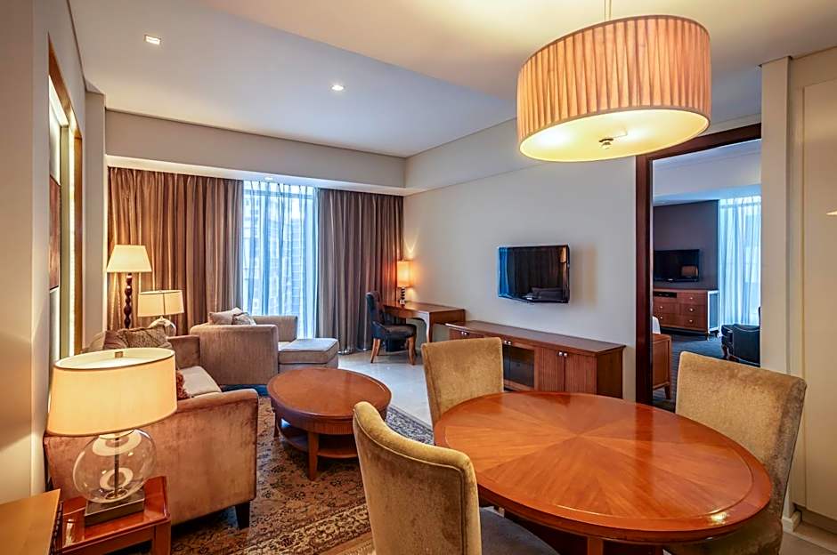 Two Bedroom Executive Suite is 861 square feet and includes either a king-size bed 150-183 width, 2 single beds 80-130 width, or a queen-size bed 150-154 width plus living room, extra beds on demand, desk, satellite tv , cable tv, hairdryer, tea and coffee making facilities , ironing set, safe, bathrobes, and slippers and is Wheelchair-accessible.
