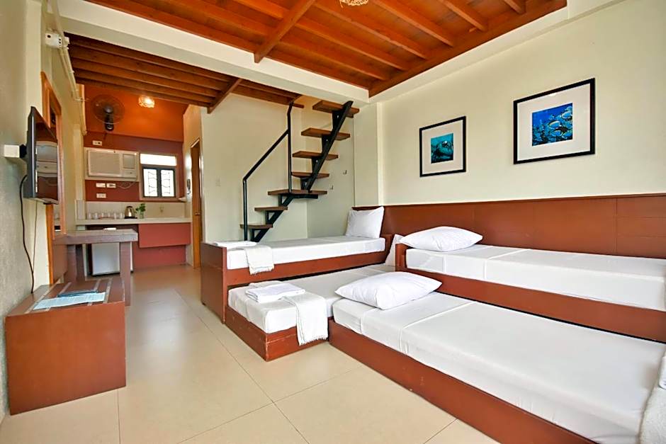 This family room opens up to panoramic sunset views of Bulabog Beach or White Beach. It features air conditioning and a fan option. The room is equipped with a flat-screen cable TV. The loft can double up as a living area. It is fitted with two single beds and extra pull-out beds. Stair access only.