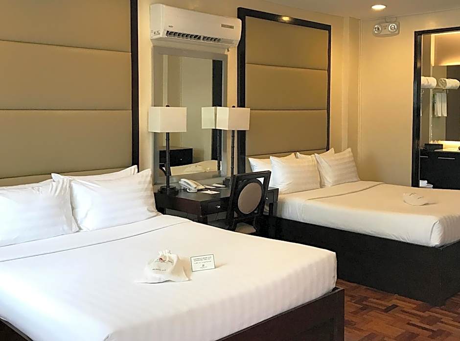 A variety of room configurations cater to different group sizes, including Quadruple Room (323 sqft) with two queen beds, Triple Room (323 sqft) with two queen beds, Standard Room (323 sqft) with two queen beds, Family (323 sqft) with two queen beds, and Room - 2 Twin (323 sqft) with two twin beds.