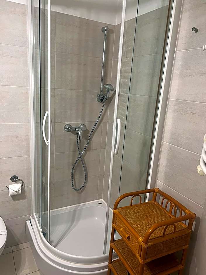 The shower needs to be refurbished: low pressure and random water temperature, too cold, too hot, then too cold again; taking a shower was not pleasant. The bed could do with a wider duvet. There is no point in having a TV in the room if it is positioned in a way that can't be watched while lying in bed.