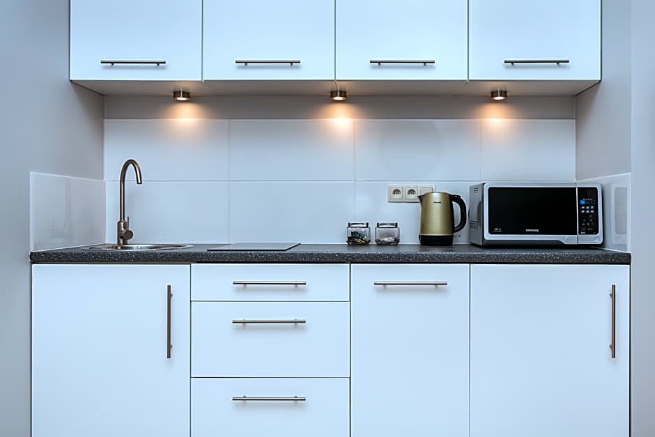This apartment is our most popular option, offering approximately 66 ft² of thoughtfully designed space. Perfect for both couples and solo travelers, it is located in the inner part of the building, providing a calmer atmosphere with windows overlooking the courtyard. The apartment features a double bed, a fully equipped kitchenette, and a private bathroom with a shower. Combining comfort, practicality, and great value, this apartment is an excellent choice for your stay.