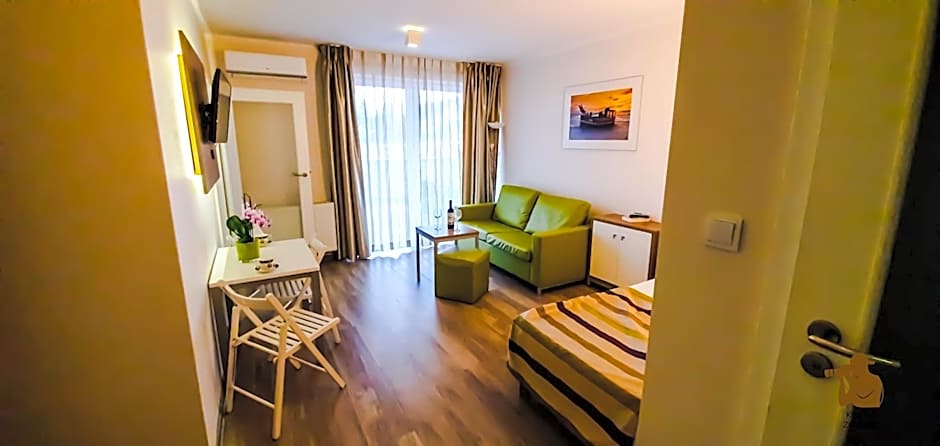 Room choices span several options. The Standard Apartment measures 431 square feet and accommodates 2 adults and 1 child, featuring 2 sofa beds and a double bed. The Superior Apartment is 323 square feet and also sleeps 2 adults and 1 child, with a double bed and a sofa bed. The Junior Suite spans 301 square feet and includes two sofa beds for flexible layouts. Studios and Deluxe Apartments are part of the lineup as well, with all options non-smoking and designed for two adults and one child.