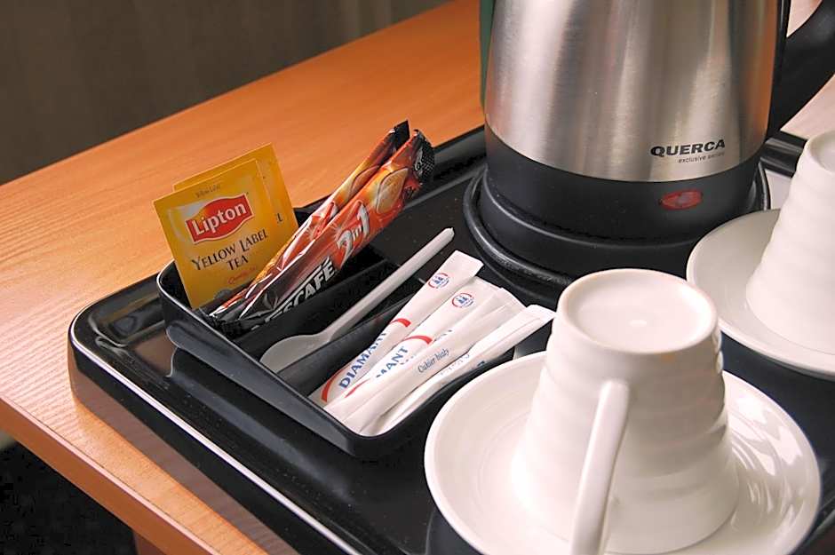 A room with a TV, a fridge and a bathroom featuring a shower, a hairdryer and free toiletries. There is also a welcome set including tea, coffee and a bottle of mineral water. Using the pool and fitness room is included in the room price.