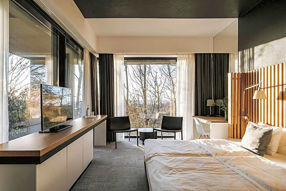 Standard plus double room (located on the lowest floor of the hotel, with panoramic windows, decorated in a minimalist style). Modern, spacious, air-conditioned, 32-square-yard double room with 2 single beds connectable and a sofa bed. The glass wall with eastern exposure makes the room bright and spacious. Bathroom with shower, functional work area, LCD smart TV with satellite TV, mini-bar with drinks and snacks, tea making facilities, wireless Internet access.
