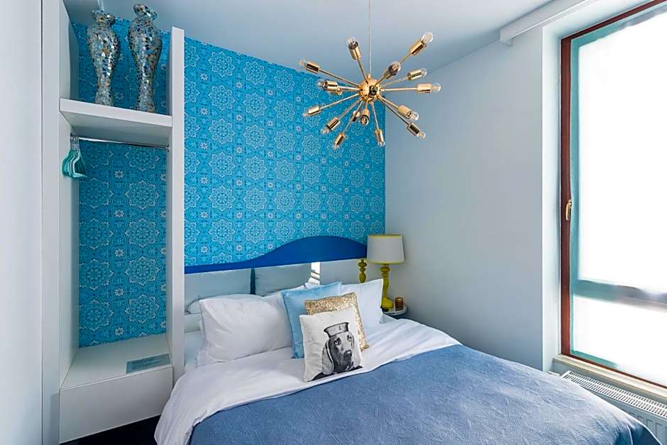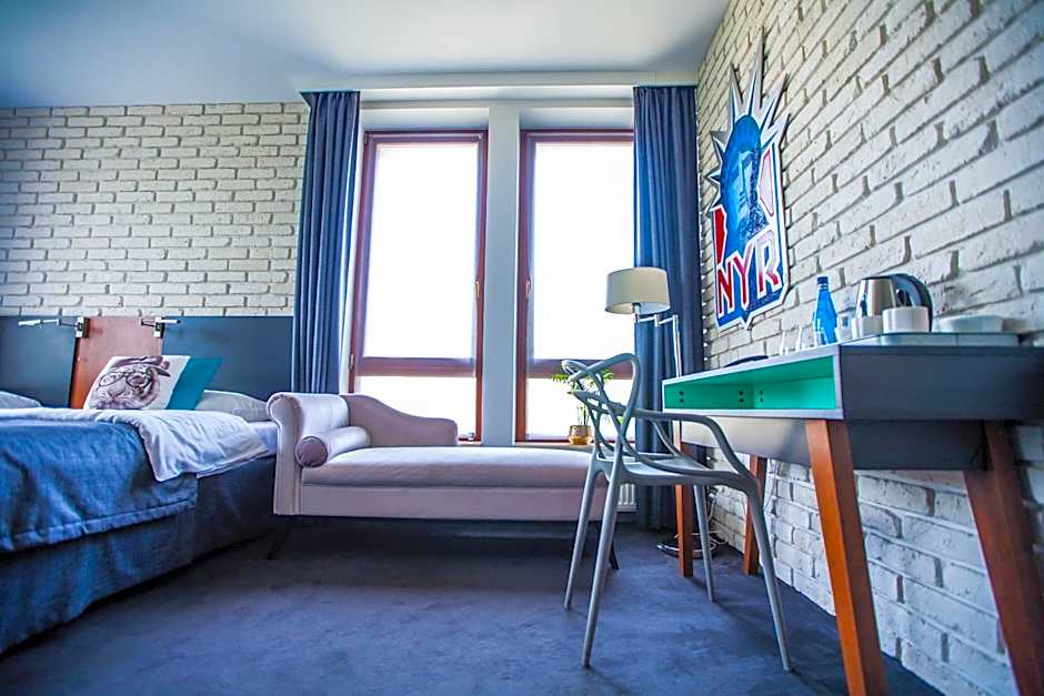 Room designed in a modern style inspired by various cities in the world. The walls feature works of art by young artists and the room offers a view of the Old Town. It also has a flat screen TV and free toiletries.