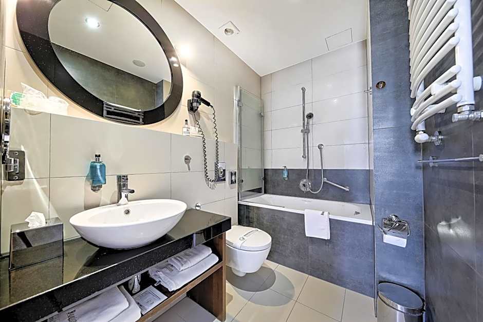 Room with a view of the Zdrojowy Square and Monte Casino promenade. The bathroom is glazed.