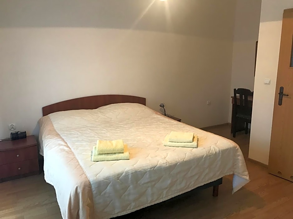 It is about 2 km from town center, so it is longer walk. There are often Polish pensioner music parties in the courtyard. It is authentic and ends at 10 pm, but I think it should be noted that there was music there almost every evening. There was no table on balconies, just two chairs.