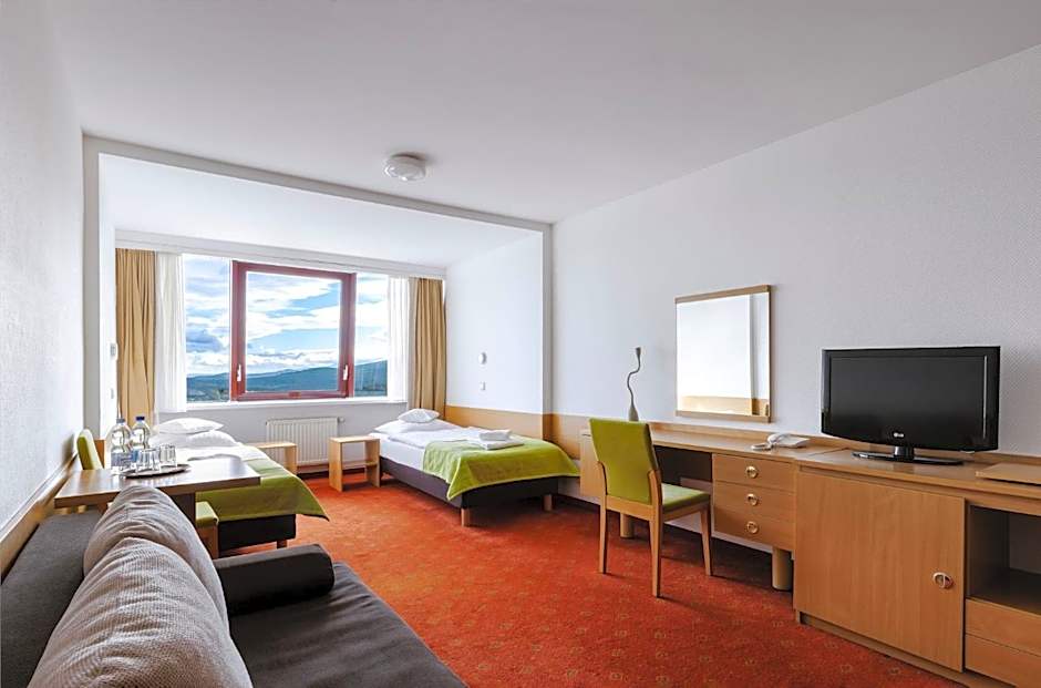 BORNIT is my favorite hotel in Szklarska Poręba not because is the best one but because of memory I keep with my friends. Hotel was modern several years ago. It was built before regulations of facilities for people with disabilities. You can find stairs in lobby; you find stairs to get at the beautiful roof-terrace (sun deck and sunset-deck). Also swimming pool is a little bit old-fashioned. But if you arrive here with kids or your friend you immediately see how fantastic locations this hotel has to plan walking tours during summer or plan trips to enjoy winter sports and fresh air. In the evening you may spend time together in specious "resting area" next to the bar. This is big hotel with all pluses and minuses but more pluses.