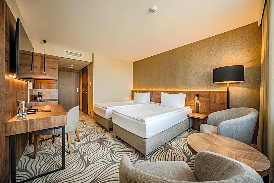 The rooms at Airport Hotel Okęcie are designed with your comfort in mind. The Superior Triple Room is perfect for traveling families or groups, accommodating up to three adults and one child. With two sofa beds, a queen size bed, and two twin beds, you'll have ample space to stretch out and relax. If you're traveling as a couple or with a child, the Comfort Double or Twin Room is an excellent choice. Equipped with a queen size bed and two twin beds, it offers cozy accommodation for two adults and one child. For a truly luxurious experience, the Apartment and Studio Apartment provide spacious accommodations with a queen size bed and additional amenities. Whatever your preferences, Airport Hotel Okęcie ensures that you have a comfortable and enjoyable stay in Warsaw.