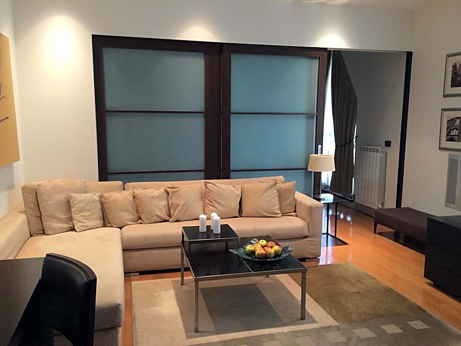 Elegant and spacious apartment with a seating area and a flat-screen TV.