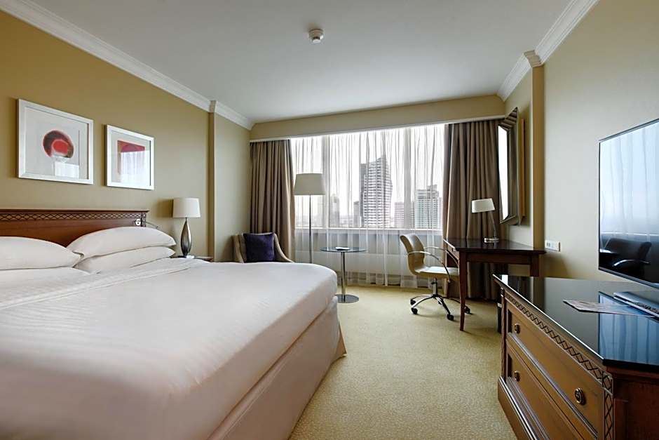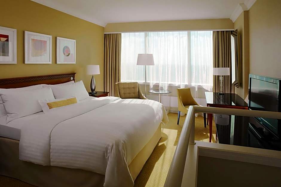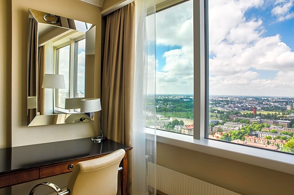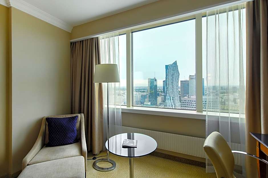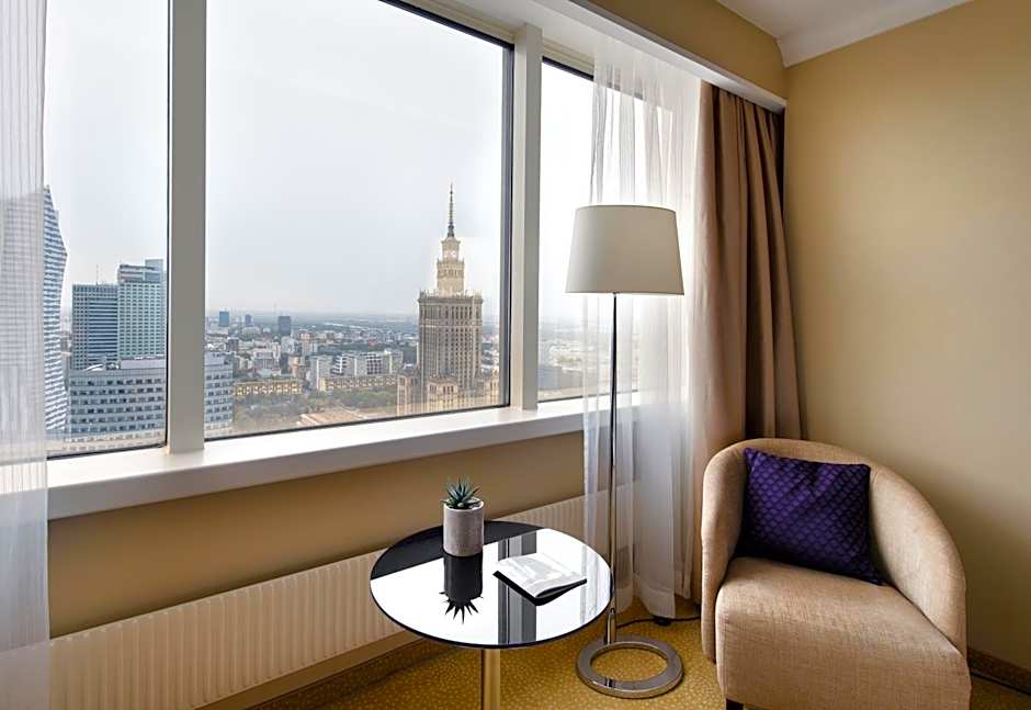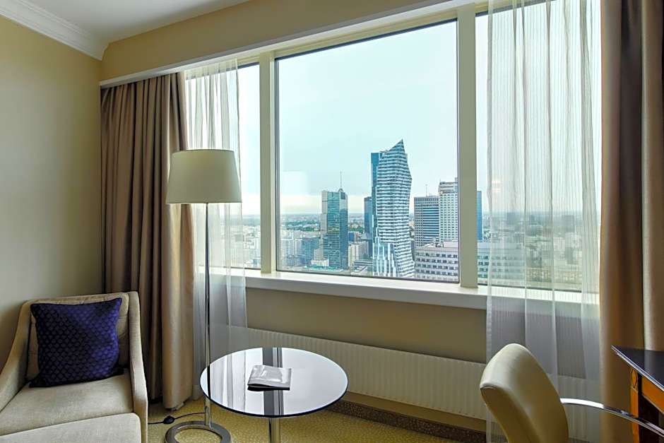 The room offers a panoramic view of Warsaw and access to the Club Lounge with a view of the city center.